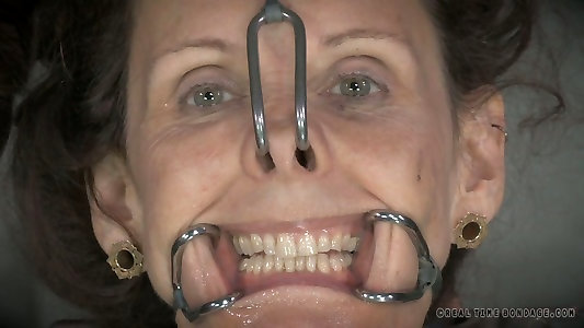 Mature dark-haired woman is bounded and toyed with iron contraptions