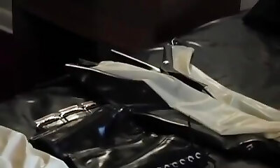 Latex condom doll in fuck-rubber dress.