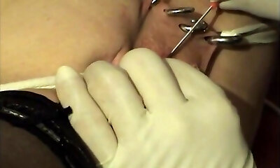 Blonde in high heels, stretches pussy with piercings